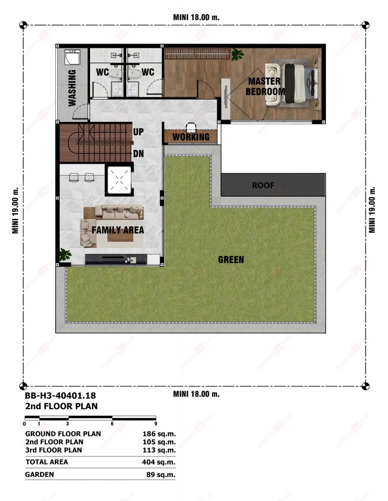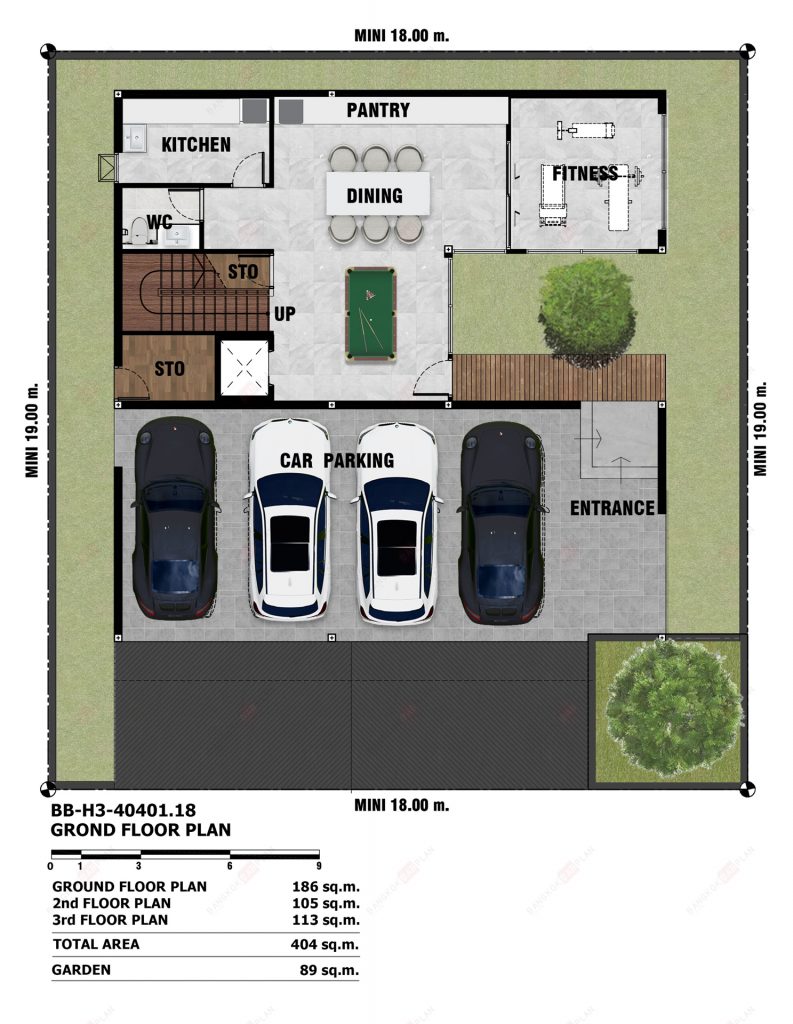 | พื้นที่ใช้สอย | : 404 ตร.ม. | ขนาดที่ดิน | : 86 ตร.ว. |