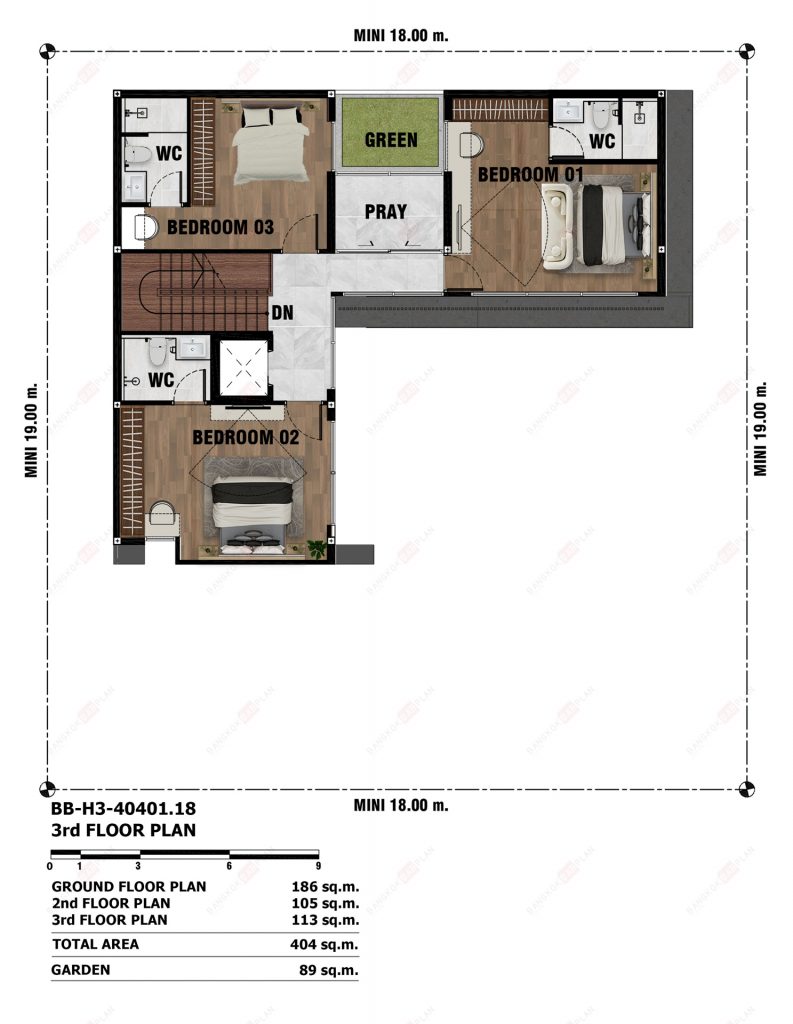 | จำนวน | : 3 ชั้น | ที่ดินกว้าง | : 18 ม. |